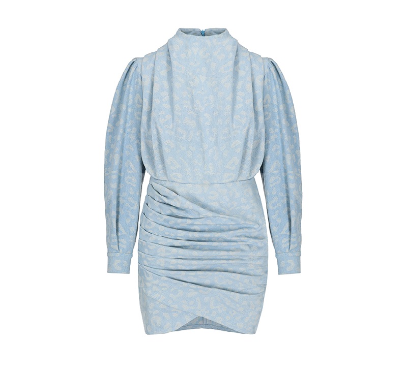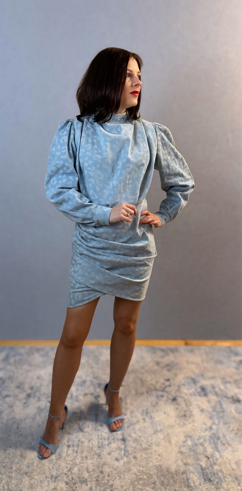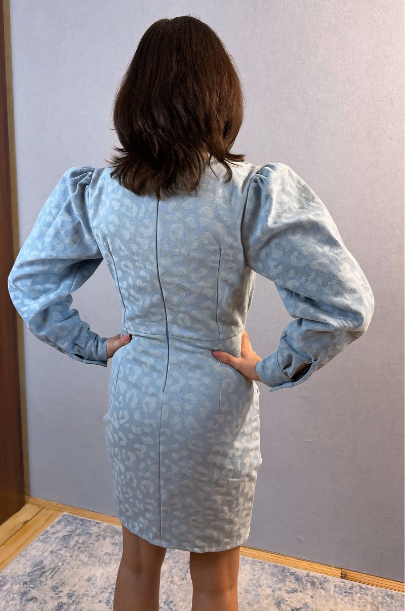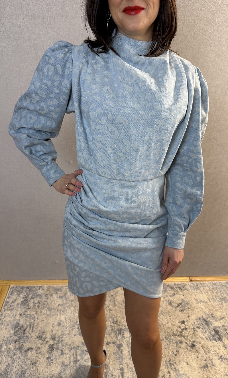 Elegancka sukienka mini w chłodnym odcieniu błękitu, wykonana z miękkiej, komfortowej tkaniny jeansowej w tłoczony zwierzęcy wzór. Model z dopasowaną górą i stójką, który podkreśla linię szyi i ramion.