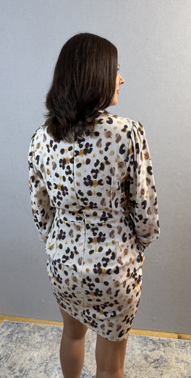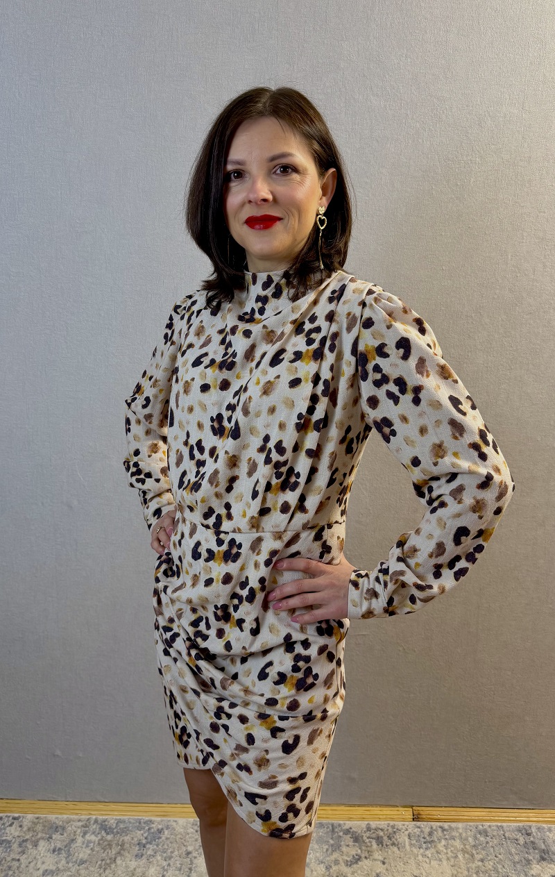 Elegancka sukienka kopertowa ze stójką, uszyta z naturalnej krepy wiskozowej z dodatkiem lnu, w oryginalny, zwierzęcy print.
